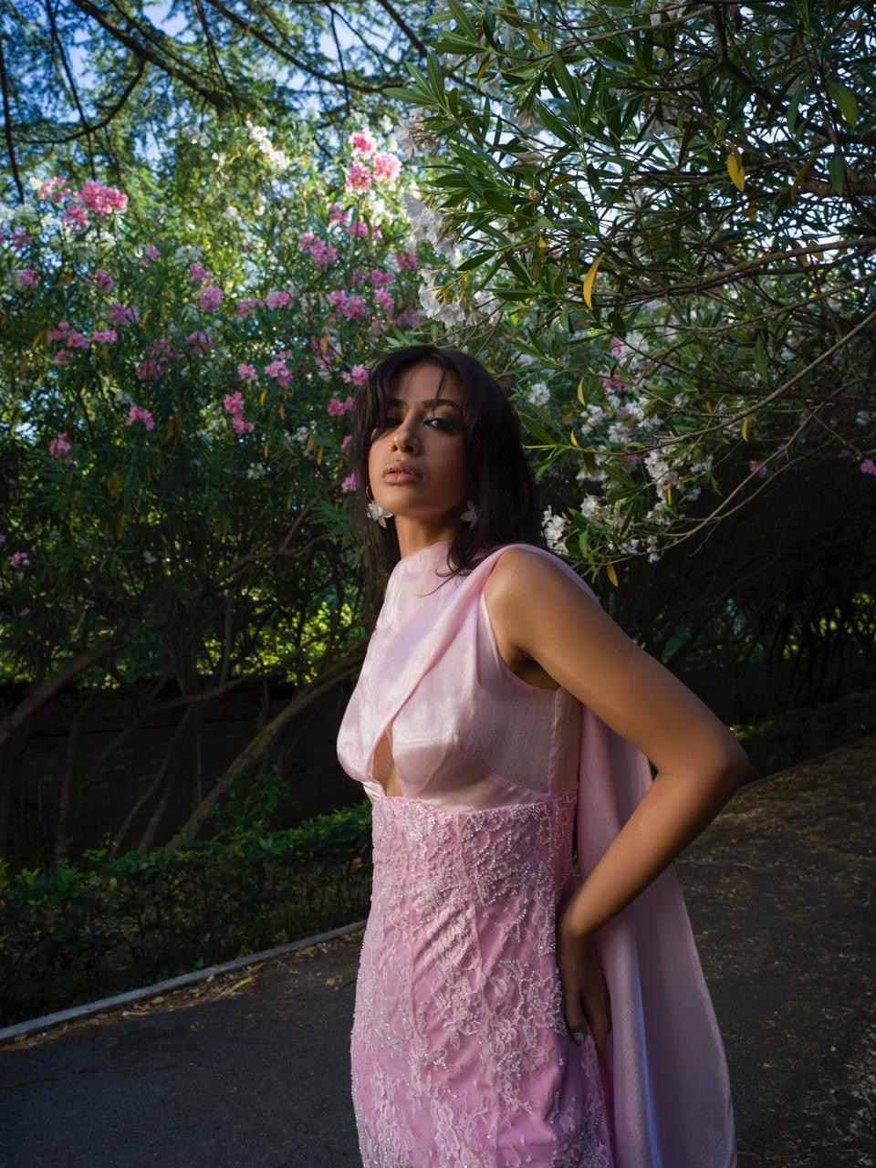A dress that is a sweet embrace of romance and finesse, long, crafted in light pink, a color that represents softness, purity, and a fresh summer feel.