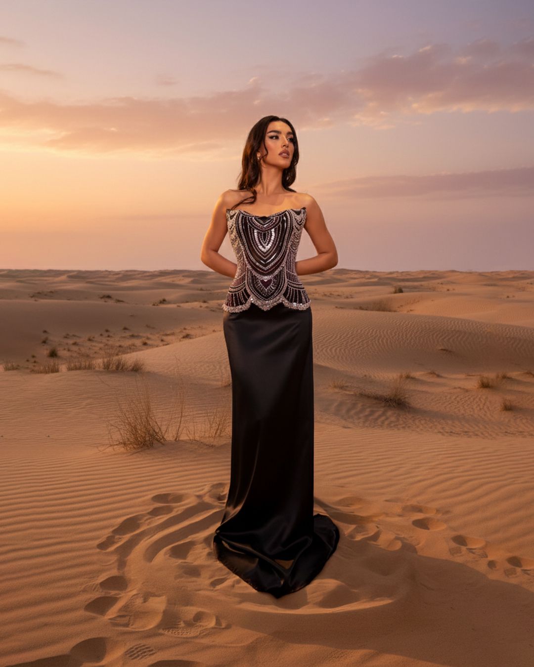 – A corset with luxurious lace, adorned with beads and sparkling stones, paired with a skirt of soft satin.”