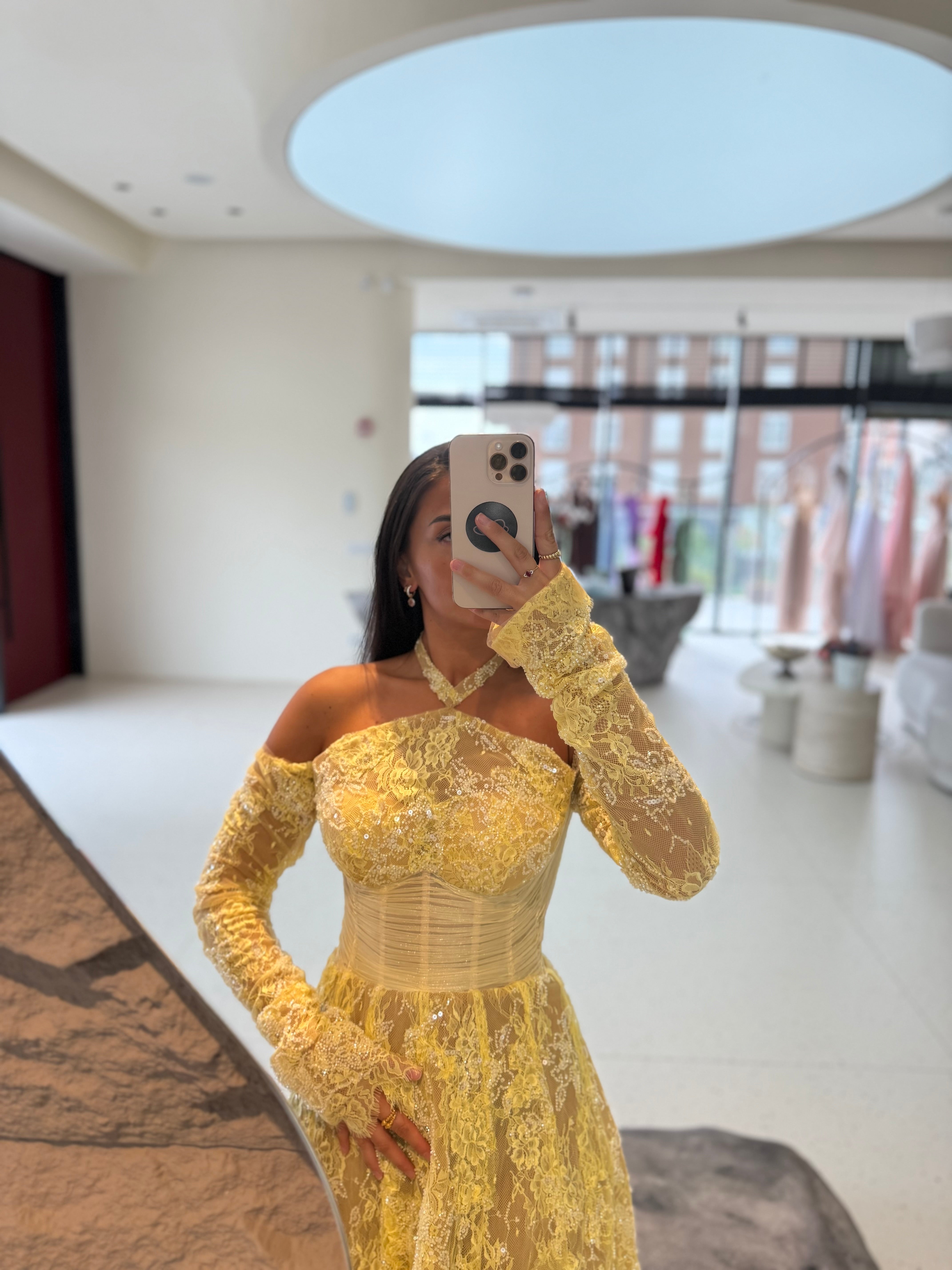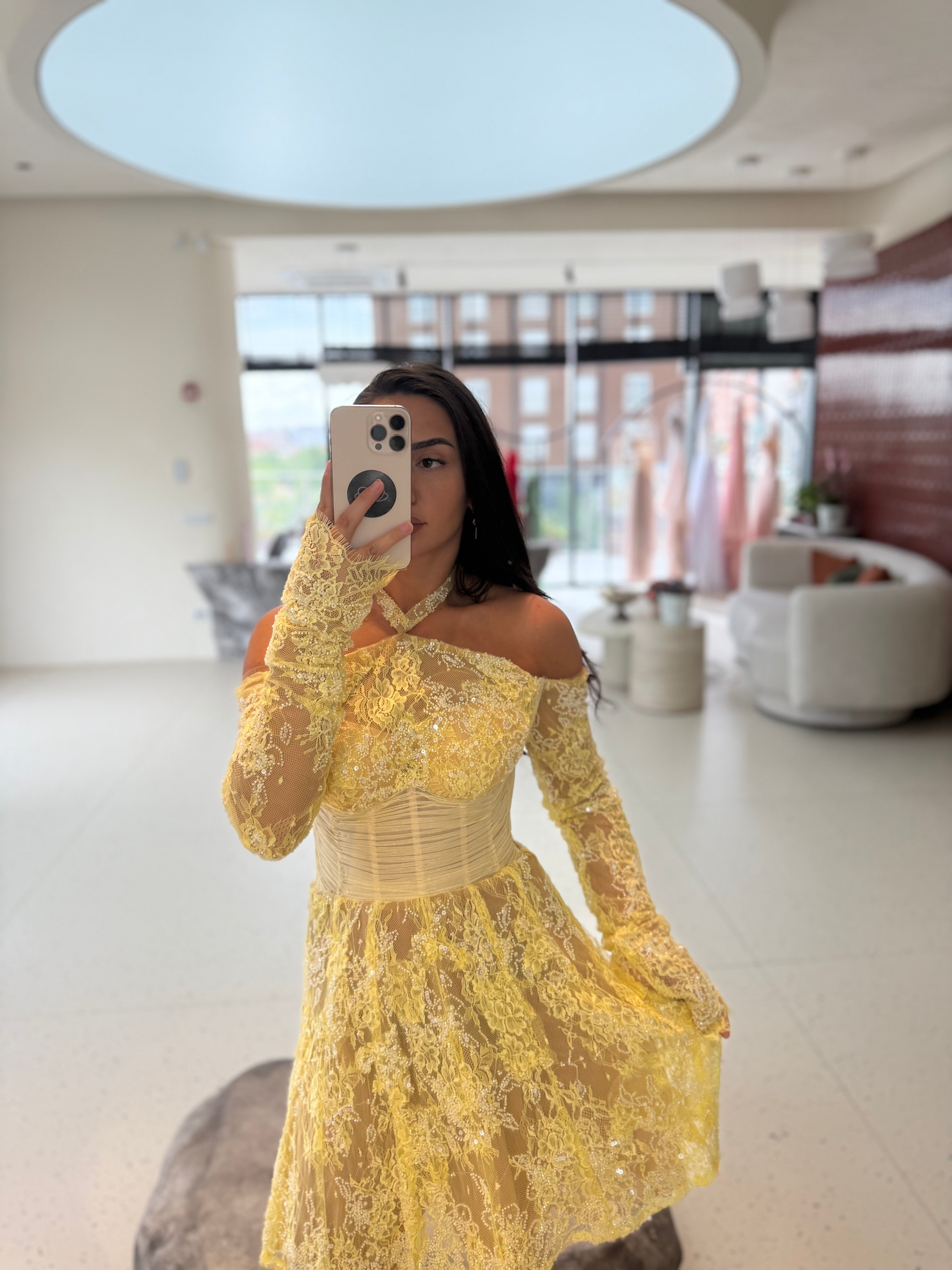 -It uses the familiar and very on-trend yellow beaded lace, with a corset that accentuates the waist.