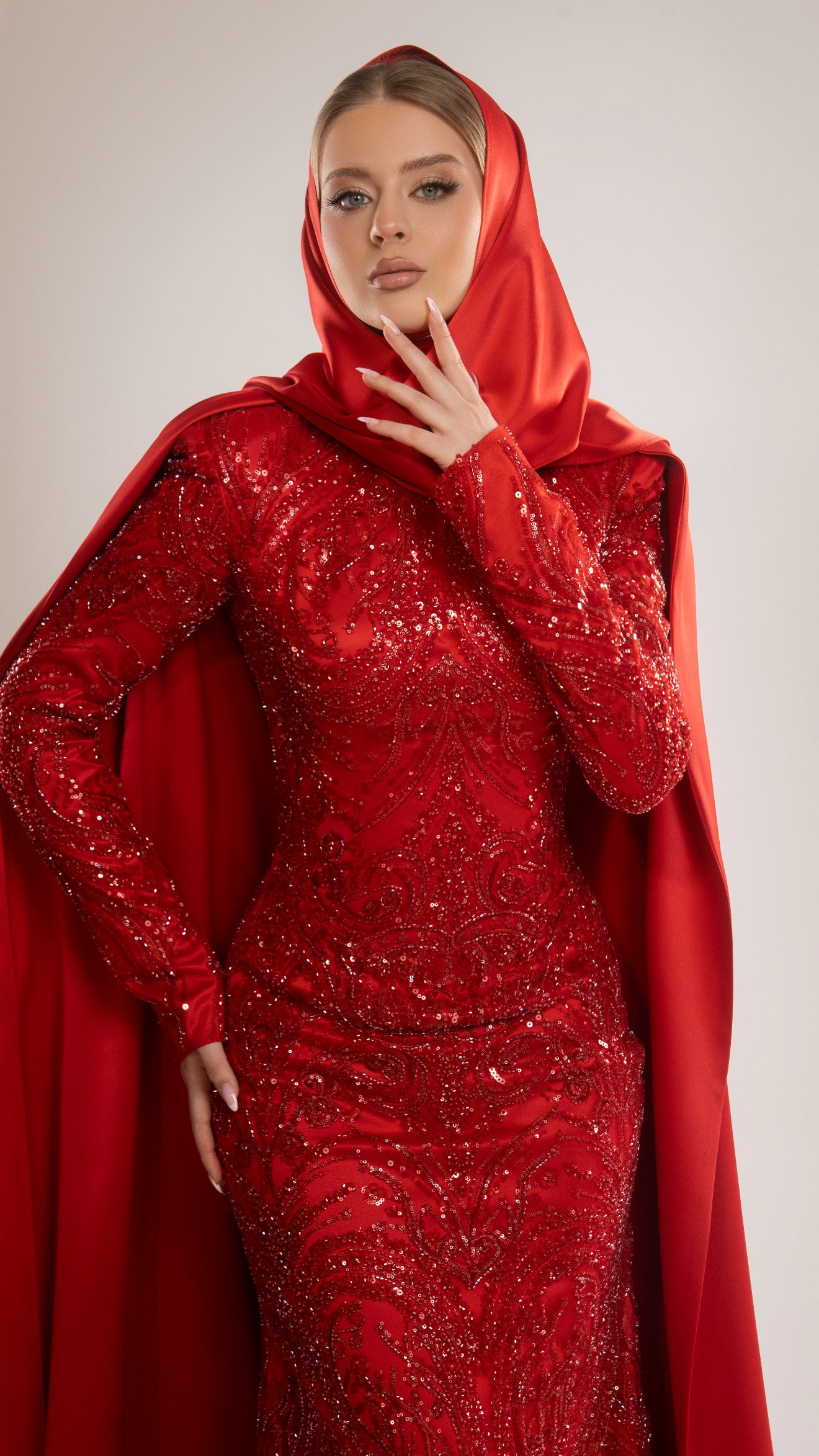 This breathtaking deep red gown is fully adorned with intricate hand-applied beadwork and shimmering embellishments, forming delicate, flowing patterns that sculpt and enhance the silhouette beautifully.